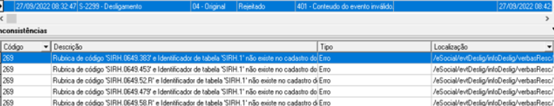 Ao enviar evento mensal S-1200 ou de desligamento S-2299/S-2399 poderá ocorrer erro acusando a falta de alguma rubrica no eSocial, conforme exemplo abaixo: