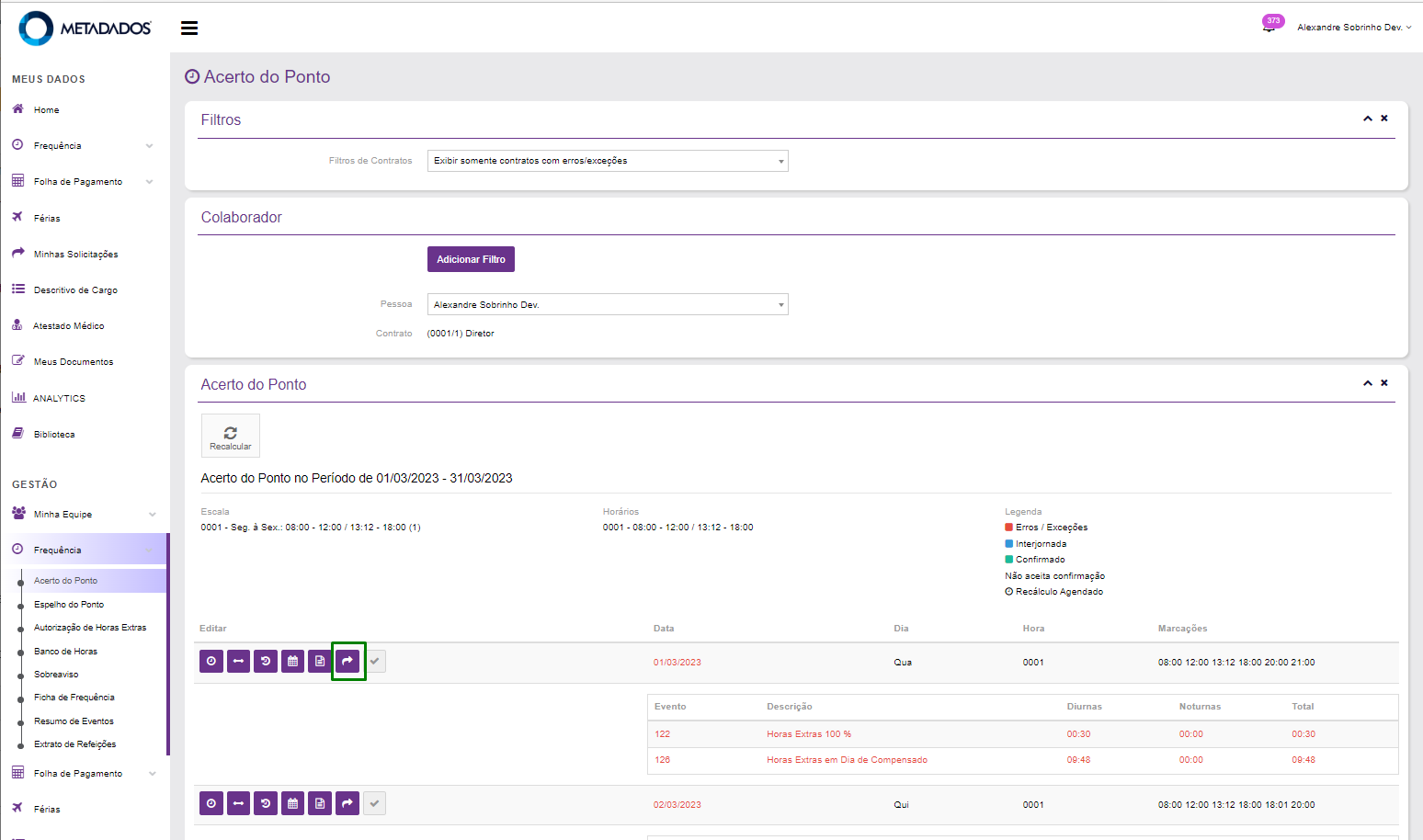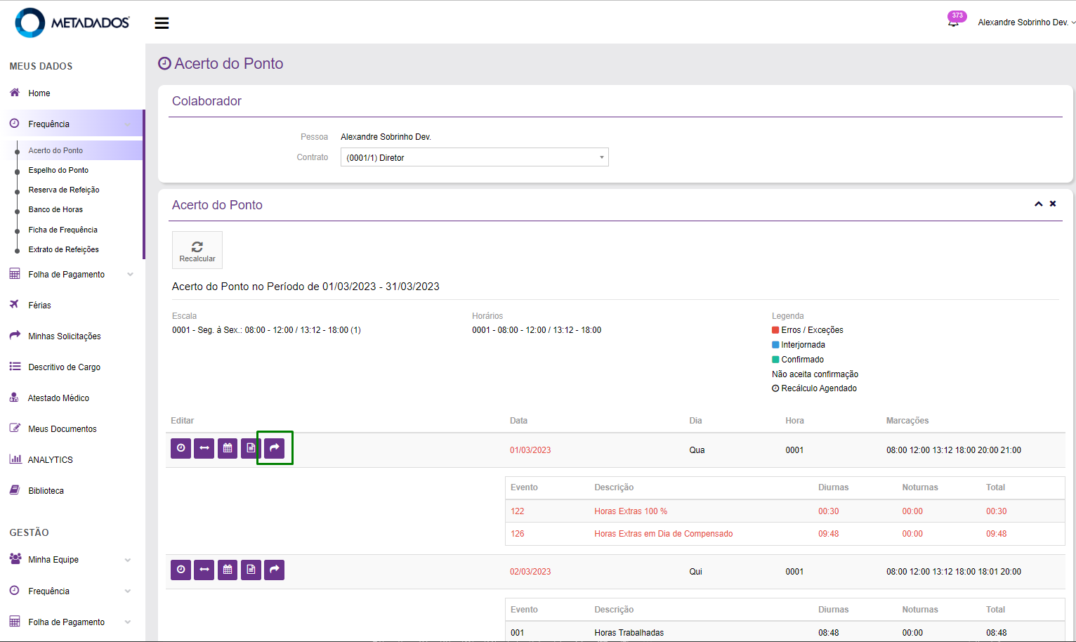 No Portal RH, acesse o Menu: Meus Dados > Frequência > Acerto do Ponto.