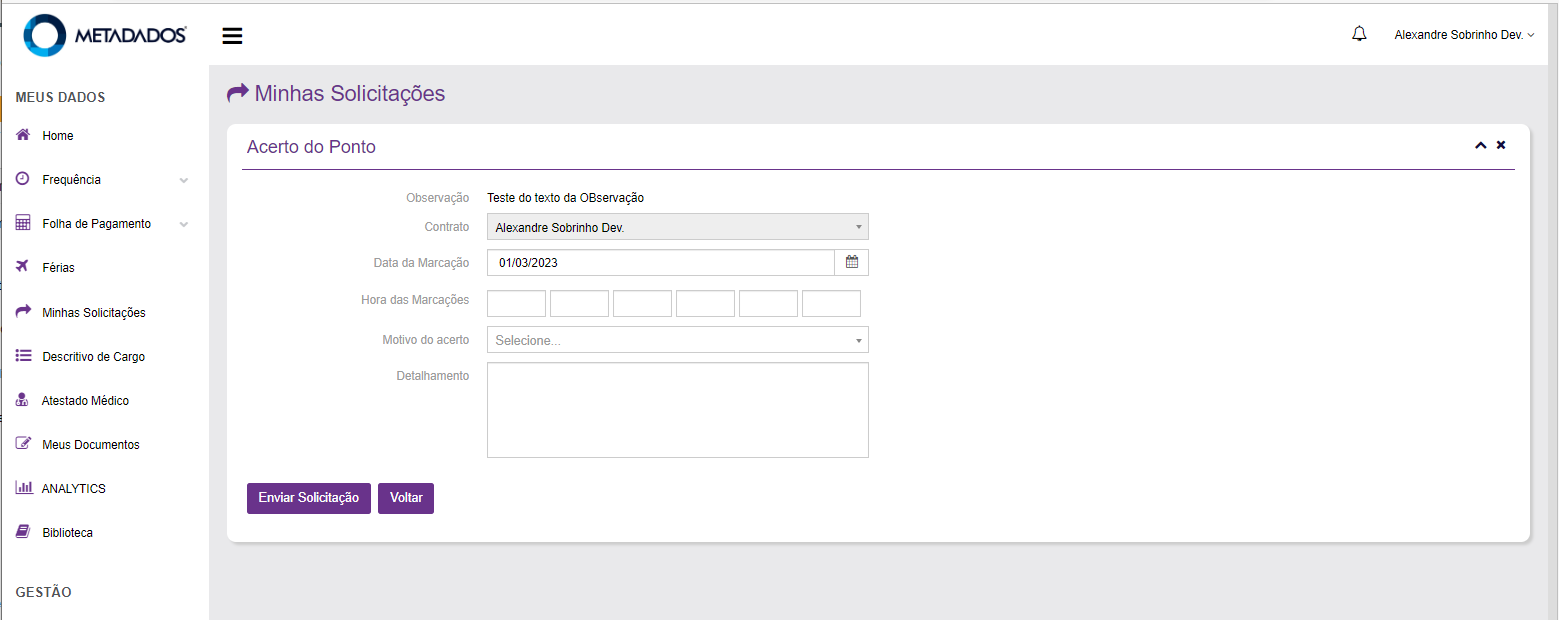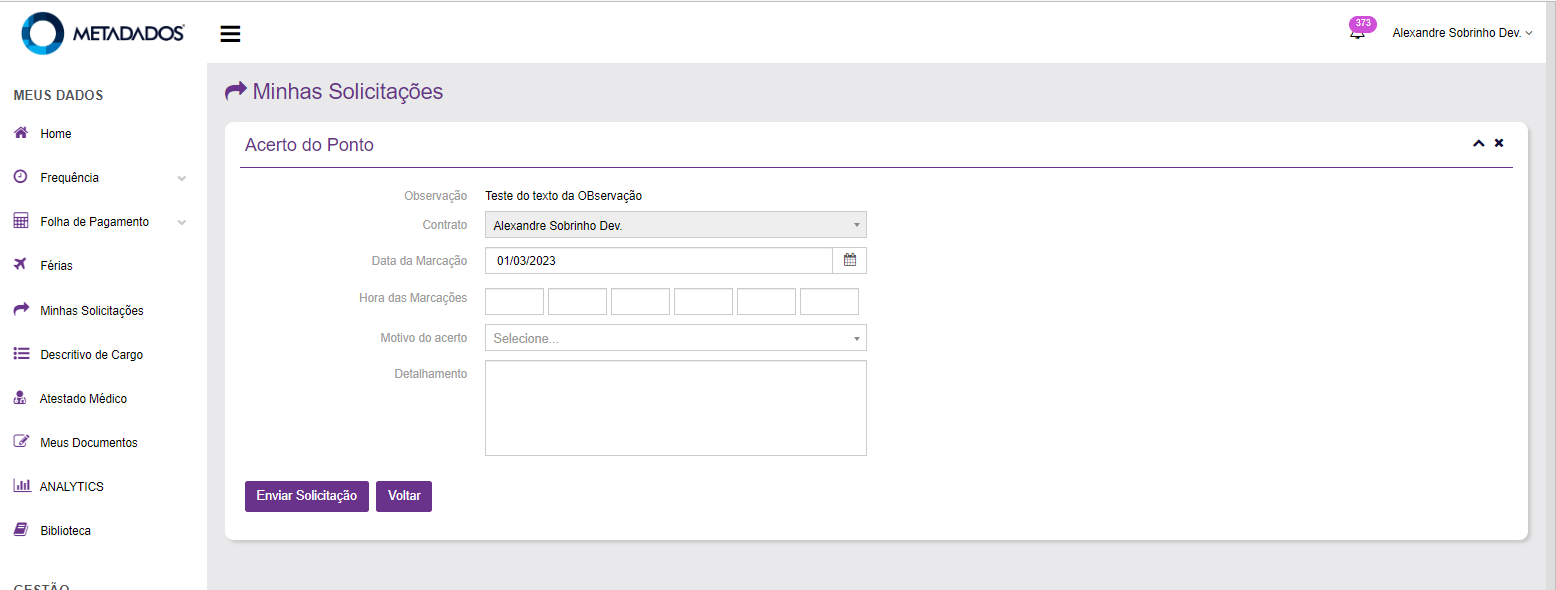 Ao clicar no atalho será aberta tela para criação da solicitação de acerto de ponto.