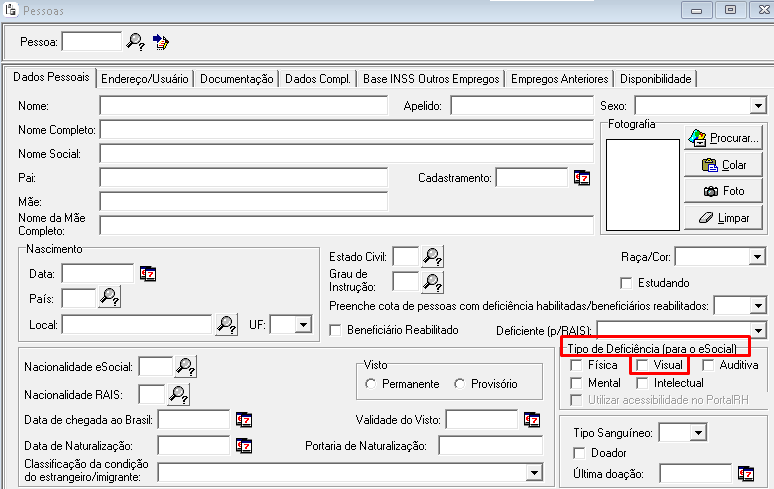 3. Verifique se o campo Tipo de deficiência (para o eSocial) está como Visual.