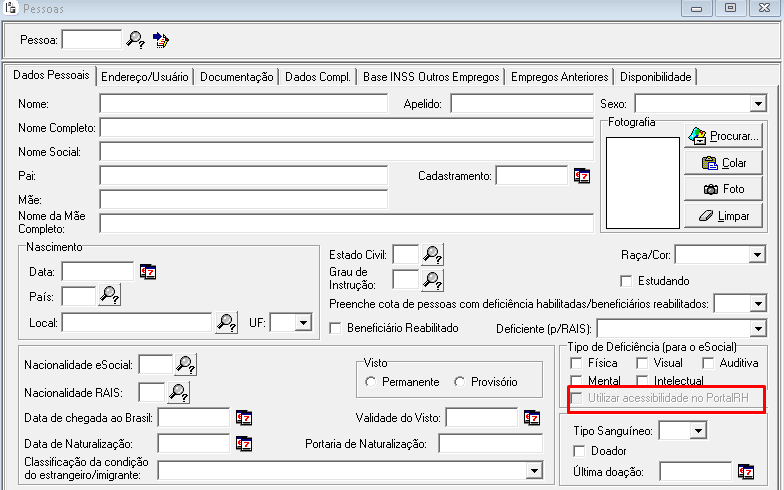 A opção Utilizar acessibilidade no Portal RH não habilita para preenchimento.
