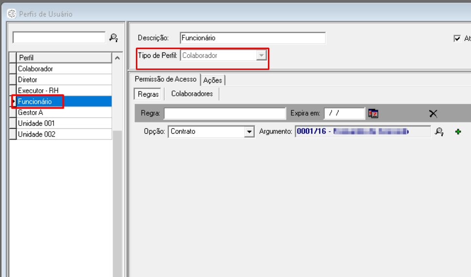 4.1. Localize o Perfil com o tipo colaborador e inclua na regra conforme abaixo: