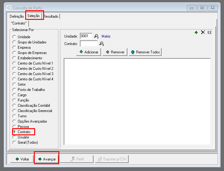 2. Clique na aba Seleção e informe o Contrato do colaborador que está visualizando as folhas dos colaboradores.
