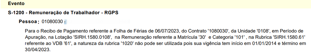 Para o Recibo de Pagamento referente a Folha de Férias de xx/xx/xxx, do Contrato 'xxx', da Unidade 'xxx', em Período de Apuração, na Lotação 'SIRH.xxx', na Remuneração referente a Matrícula 'xxx' e Categoria 'xxx' , na Rubrica 'SIRH.xxx' referente ao VDB 'xxx', a natureza da rubrica '1020' não pode ser utilizada pois sua vigência tem início em 01/01/2014 e término em 30/04/2023.