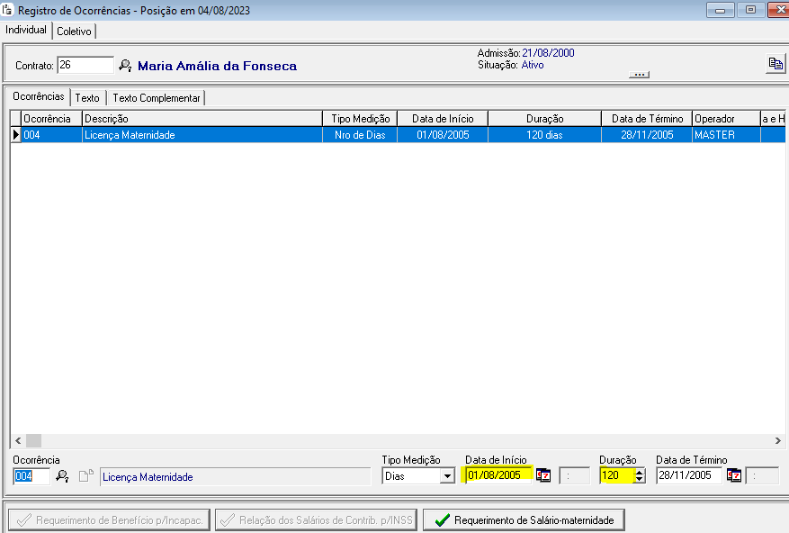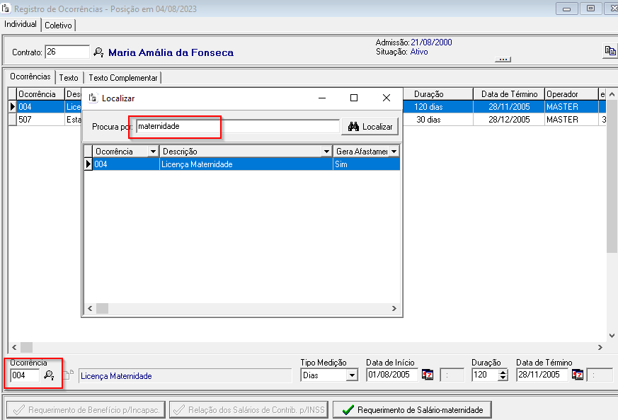 2. Informe o Contrato da funcionária e pesquise na lupa em Ocorrências a Licença Maternidade.