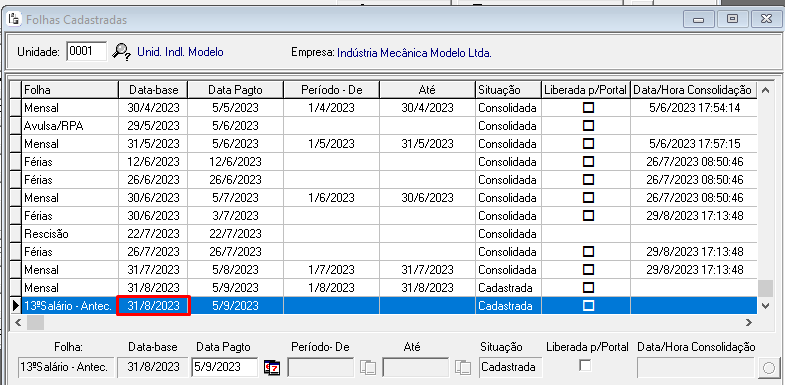 Se a folha de 13º Antecipação estiver cadastrada com a última data do mês, a mesma deve ser alterada, pois essa data é exclusiva para a mensal.