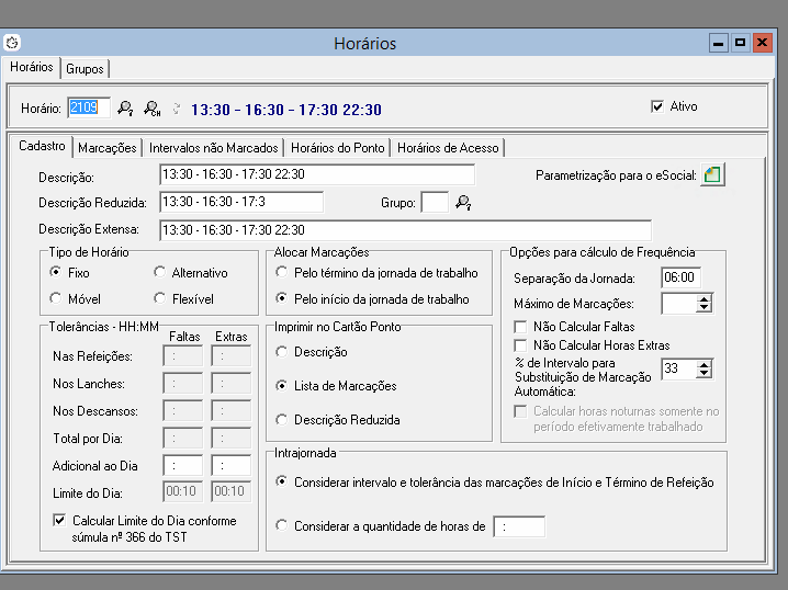 Para ajustar o cadastro do horário, no Módulo Frequência, acesse o Menu: Tabelas do Ponto > Horários.