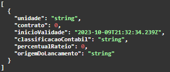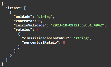 - GET /colaborador/contratosRateio: retorna os rateios contábeis por contrato. Se pode realizar o filtro (queryParam) por unidade, contrato, classificacaoContabil, dataInicio e dataFim. O retorno da chamada possui a seguinte estrutura: