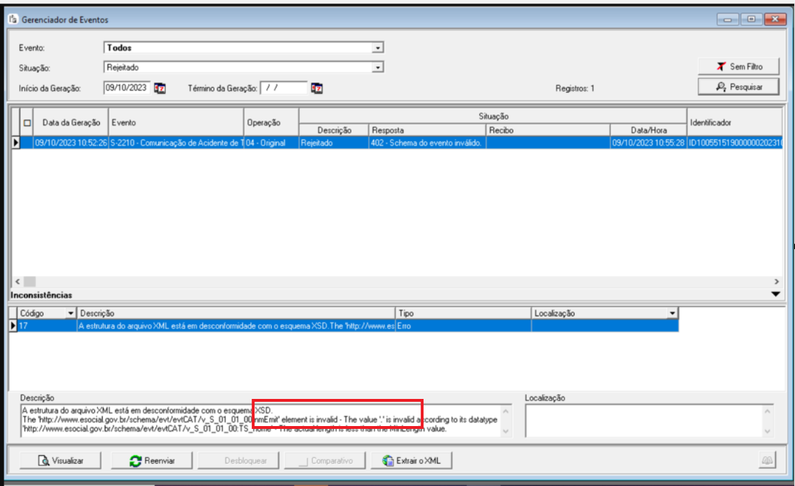 Na transmissão da CAT o Evento do eSocial retorna com o seguinte erro: