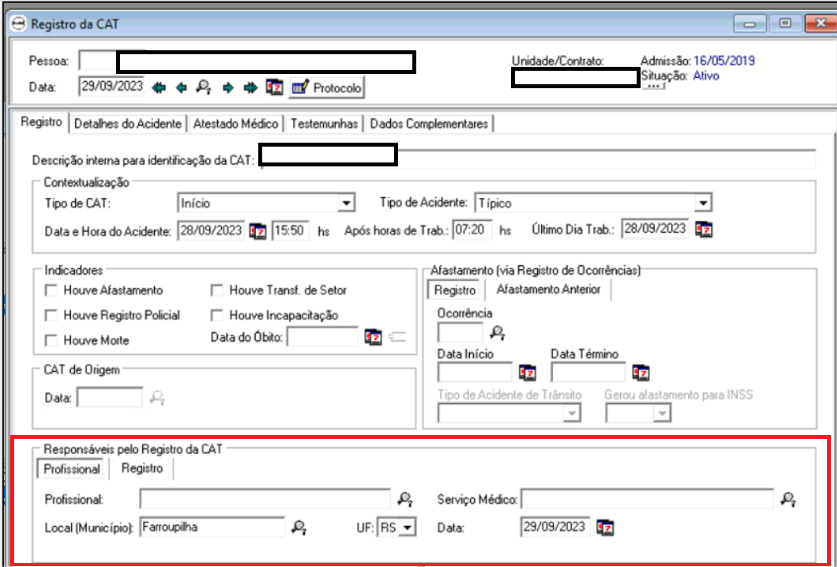 Verifique se no cadastro da CAT os campos do quadro Responsáveis pelo Registro da CAT estão preenchidos.