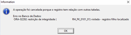 A operação foi cancelada porque o registro tem relação com outras tabelas.