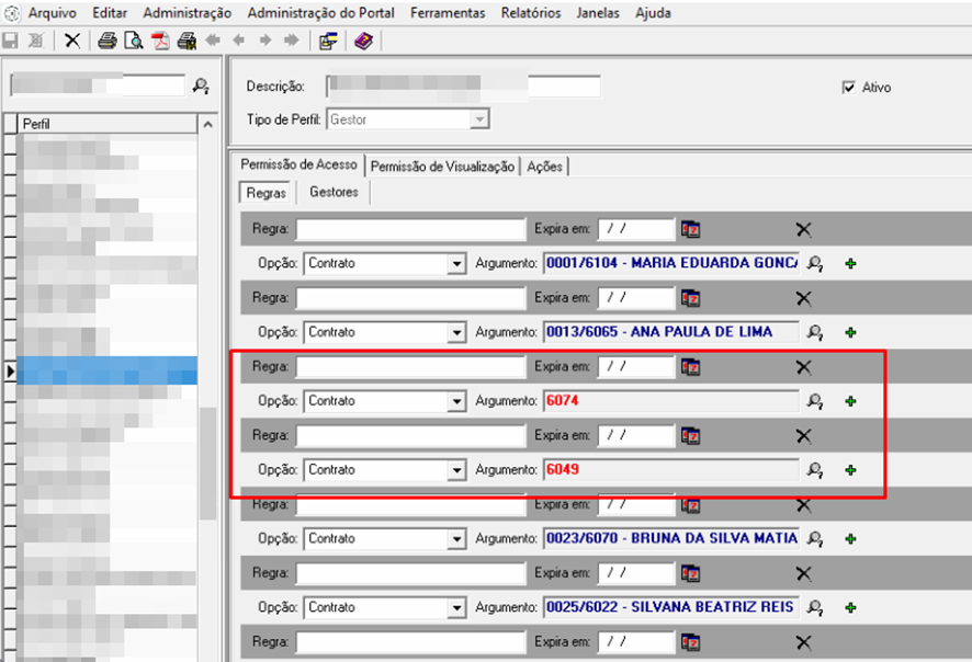2. Selecione os perfis citados na mensagem e avalie se consta alguma regra em vermelho: