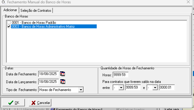 2. Marque o Banco de Horas desejado informando as datas para fechamento e lançamentos dos eventos de fechamento do banco de horas (repare que a data é a mesma).
