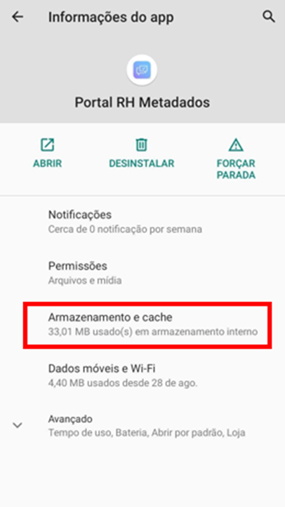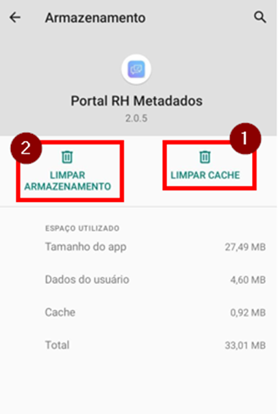 Se ao limpar cache (1) e acessar novamente o app do Portal RH o erro persiste, faça a limpeza do Armazenamento (2).