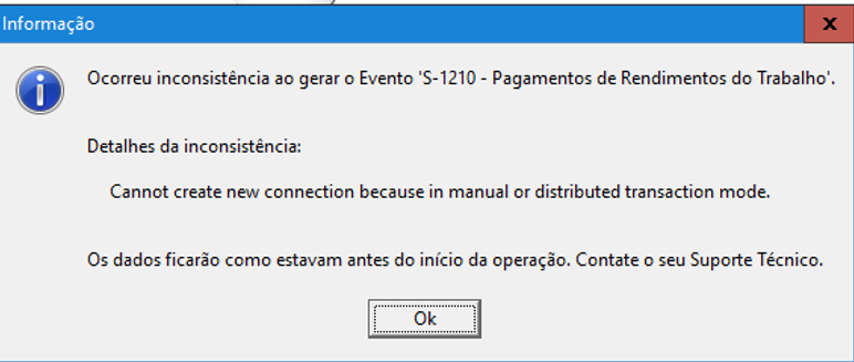 Ao enviar eventos mensais, ocorre a seguinte mensagem: "Cannot create new connection because manual or distributed transaction mode".