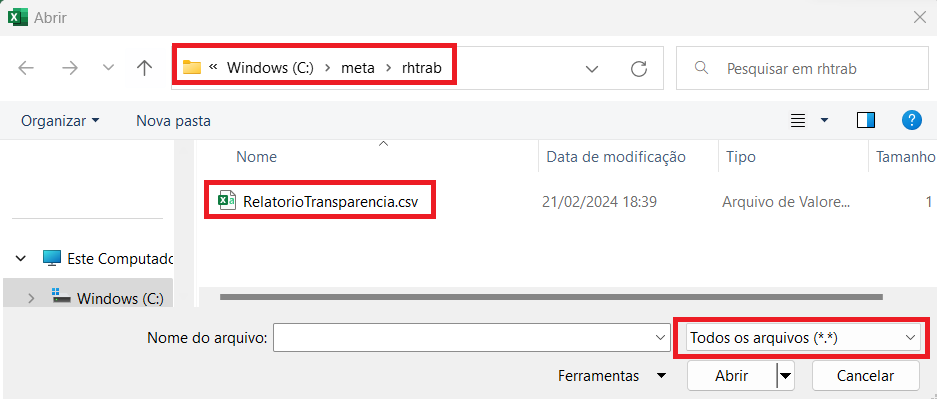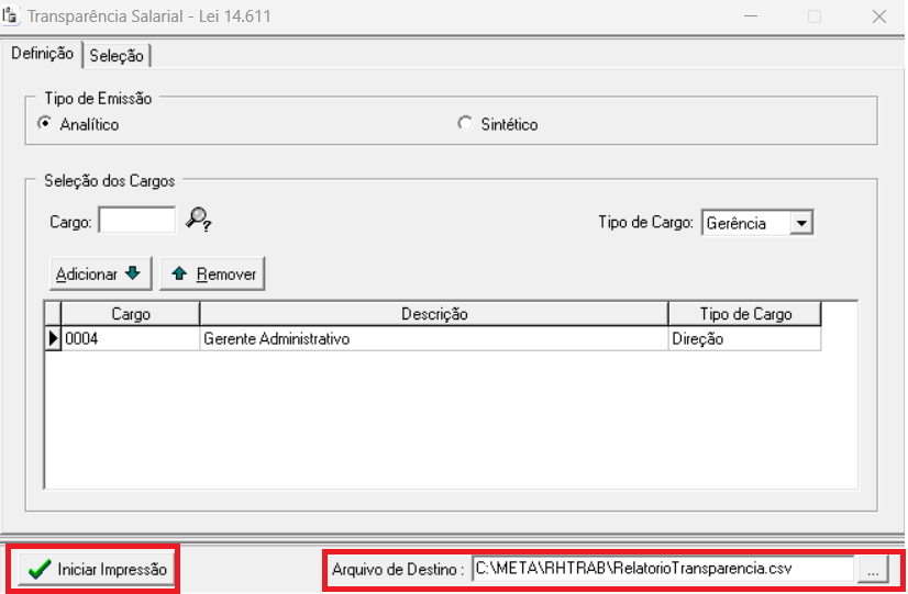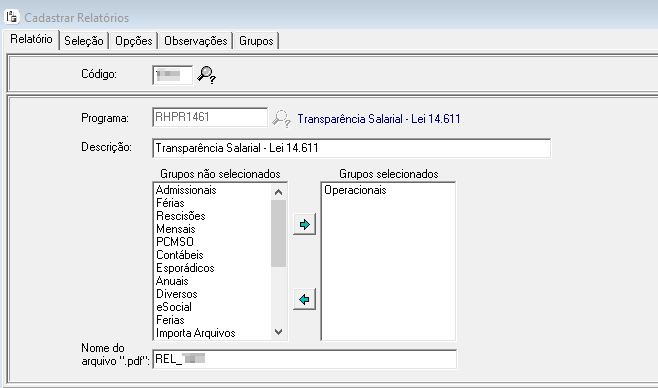 O Relatório RHPR1461 - Transparência Salarial servirá apenas para conferência interna da empresa, e não substitui o Relatório de Transparência Salarial e de Critérios Remuneratórios disponibilizado pelo Ministério do Trabalho e Emprego no Portal Emprega Brasil (https://servicos.mte.gov.br/empregador/).