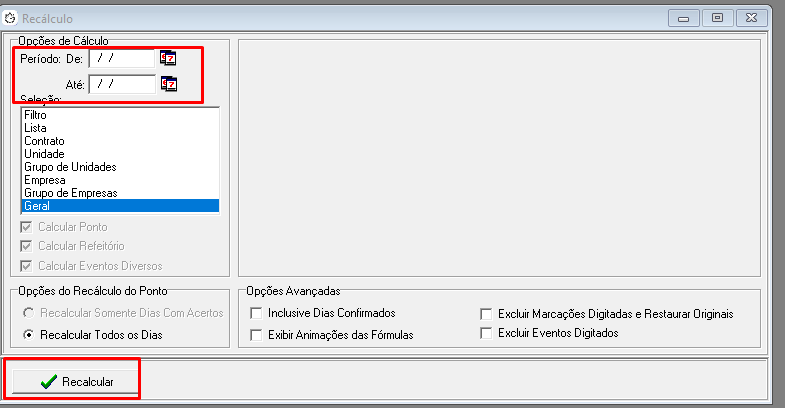 Após alterar a configuração, é importante Recalcular o Ponto no sistema para garantir que as mudanças tenham efeito e que a apropriação ocorra corretamente.