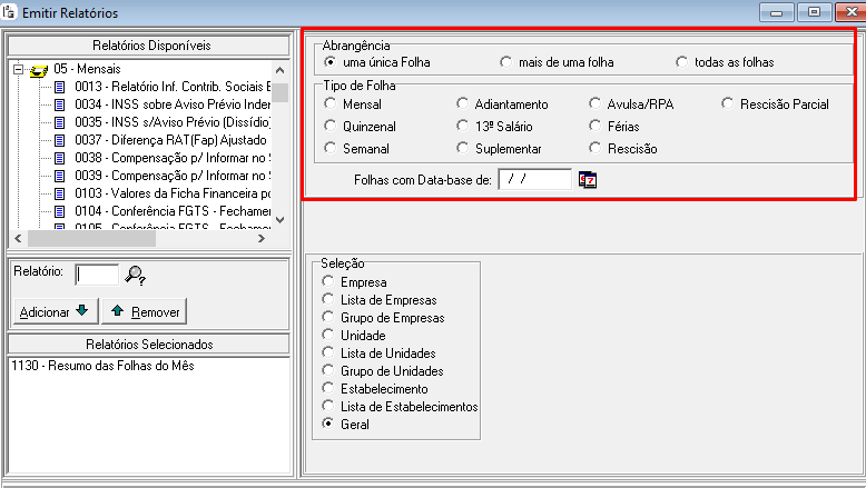No momento da emissão de um Relatório, o Filtro de Folha é exibido: