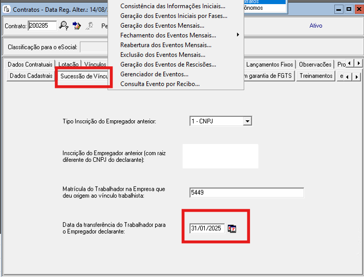Entra no cadastro do contrato e na aba eSocial / Sucessão de Vínculo, verifique como está o campo Data da Transferência essa data precisa ser a data de Admissão na destino nesse caso altere para 01/02/2025 e salva, depois faça as alterações.