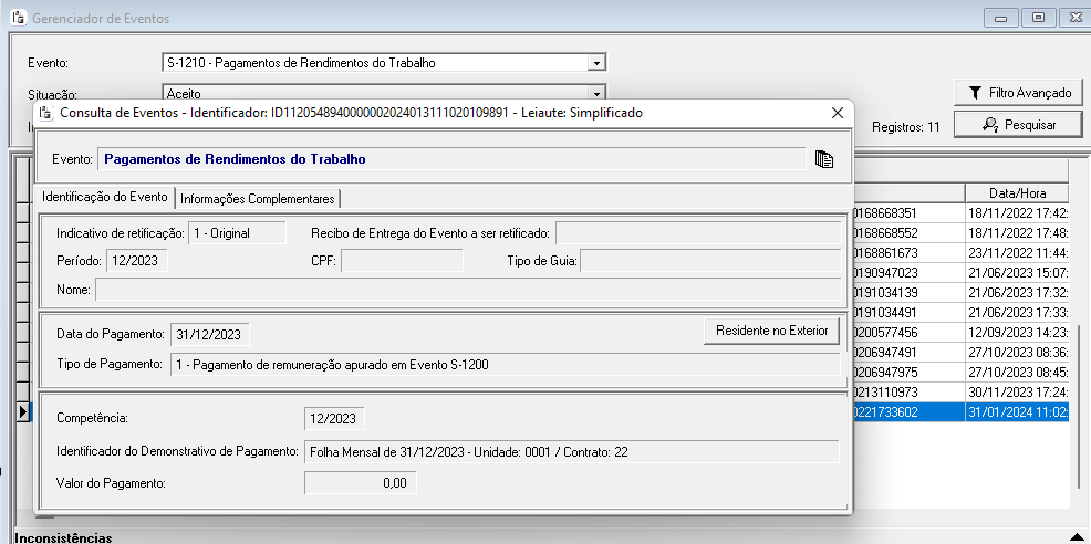 A lógica de processamento dos Eventos é que para cada Evento de Pagamento (S-1210) haja um Evento com as informações da Folha (S-1200) que está sendo paga.