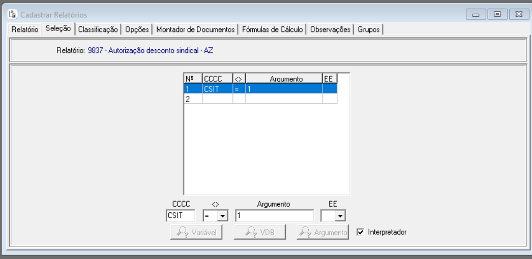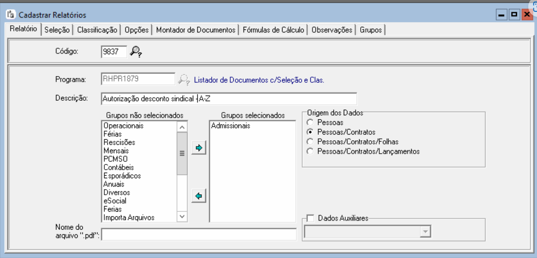 1. O Relatório não existia, por isso deve-se criar o Relatório 9837 (Autorização desconto sindical - AZ), copiando o modelo existente 0206, porém, escolhendo o RHPR1879.