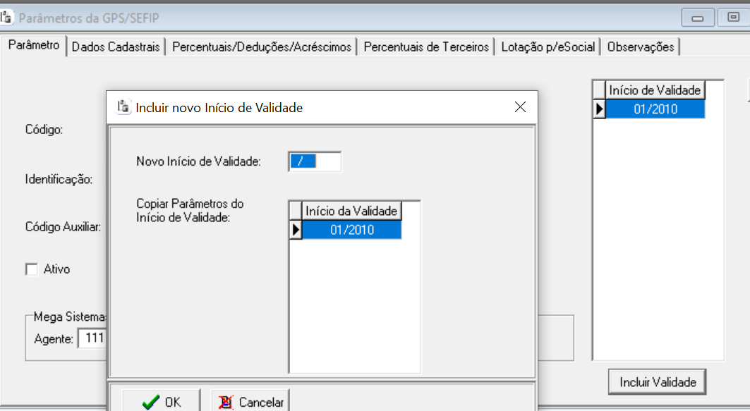 1. No Módulo Folha de Pagamento, acesse o Menu: Arquivo > Tabelas Diversas > Tabelas para Cálculo de GPS > SEFIP > Parâmetros de GPS/SEFIP.