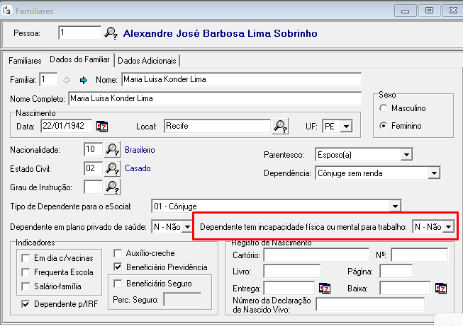 No Cadastro do Familiar o campo "Dependente tem incapacidade física ou mental para o trabalho" está em branco: