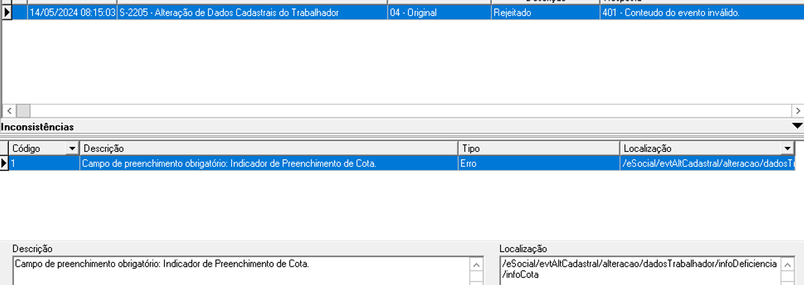 Ao gerar uma Admissão ou Alteração Cadastral, é retornada a seguinte inconsistência:
