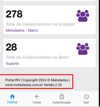 2.1. Acesse o Portal RH pelo APP, na parte inferior terá a informação da versão.