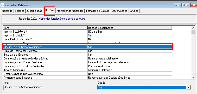 3. Na aba Opções poderá marcar a opção Mostrar tela de Seleção adicional, possibilitando, no momento da emissão do Relatório, selecionar o Centro de Custo: