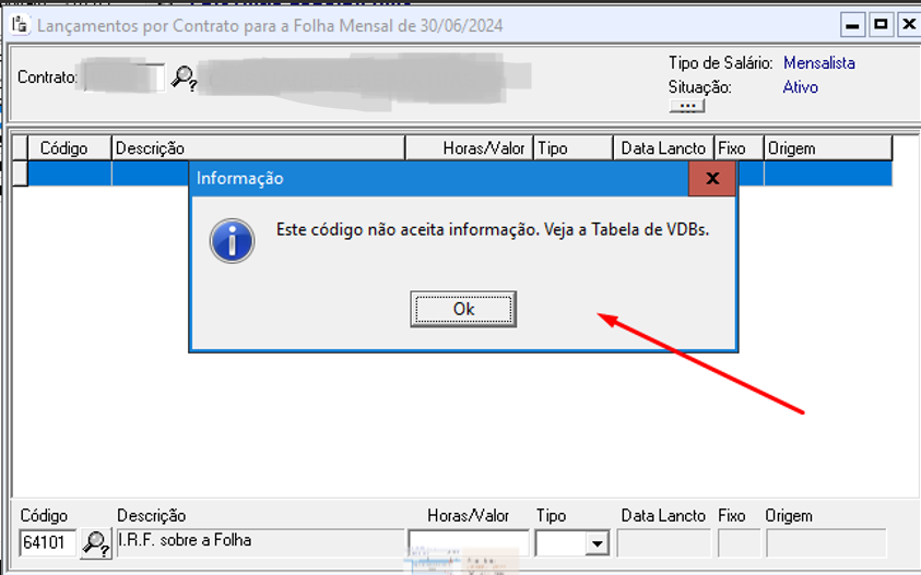 Ao lançar VDB em valor, mesmo que seja nulo, ou seja, 0,00, aparece na tela a Informação Este código não aceita informação. Veja a Tabela de VDBs.