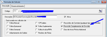 2. Localize qual é o Cálculo com a fórmula já criada e confira se a opção Rescisão Complementar de Dissídio está marcada: