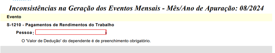 Ao enviar os Eventos Mensais, aparece o Erro: O 'Valor de Dedução' do dependente é de preenchimento obrigatório. Esse erro ocorre no envio do Evento S-1210 e está relacionado à falta de preenchimento do valor de dedução do dependente.