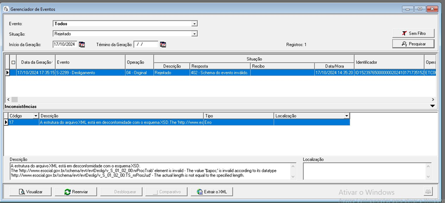 Ao calcular uma rescisão, o evento S-2299 é gerado com a seguinte mensagem de erro:
