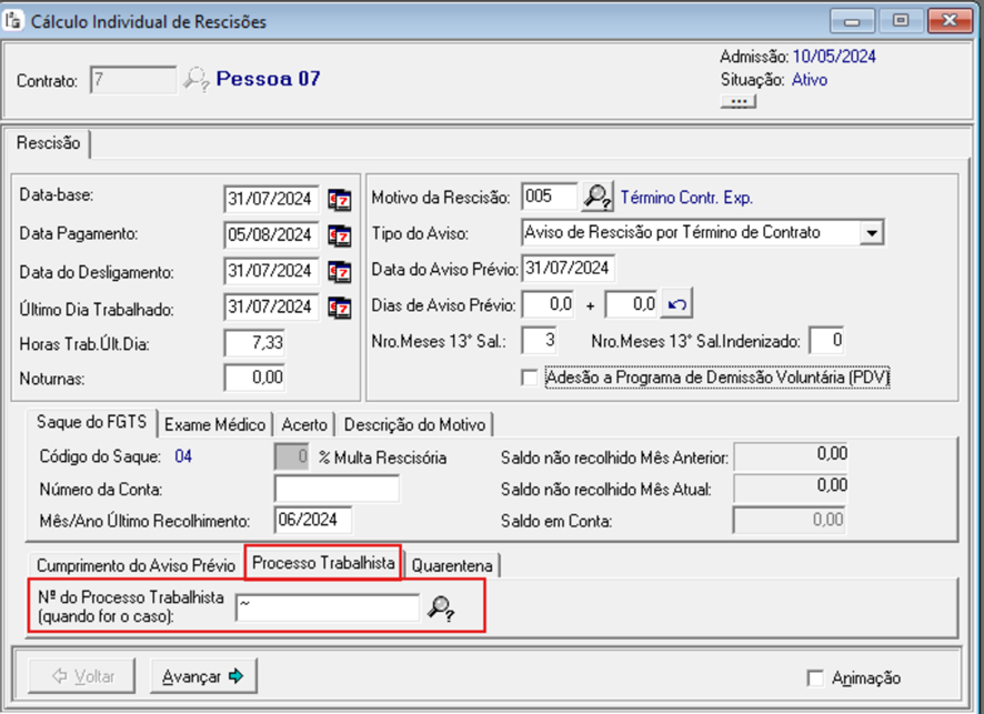 Na tela inicial do Cálculo Individual de Rescisões, na guia Processo Trabalhista, foi informado algum caractere especial no campo Nº do Processo Trabalhista.