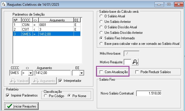 - Após a revisão, marque a opção Com Atualização e clique em Iniciar Reajustes.