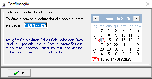 - Confirme a data para registro das alterações a serem efetuadas e clique no botão OK.
