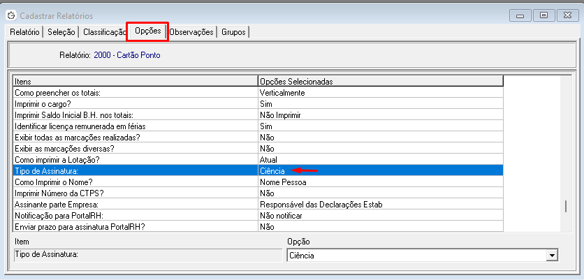 - Na guia Opções, clique no item Tipo de Assinatura e altere a opção para Ciência.