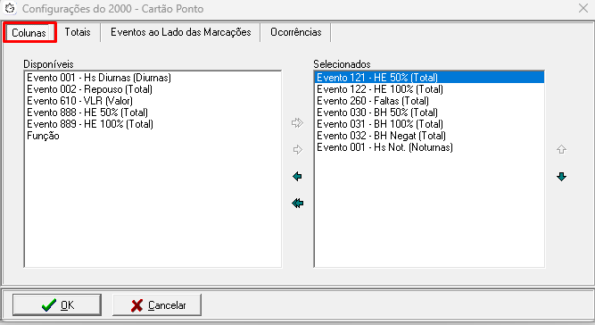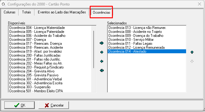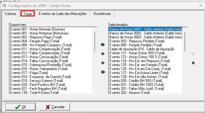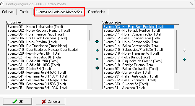 👉 Para configurar eventos ou ocorrências no Espelho de Ponto, selecione a aba desejada conforme explicado acima e mova o evento ou ocorrência para a coluna da direita, em “Selecionados”. Dessa forma, o item será exibido no Espelho de Ponto.