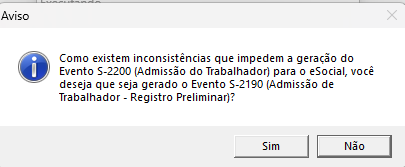Caso o usuário opte pela opção NÃO, o sistema não gravará as informações de admissão, as quas podem ser corrigidas para o envio direto do S-2200