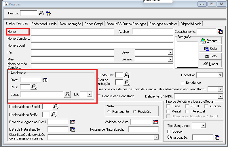 Pra gerar o S-2190, você deve cadastrar a Pessoa com as informações obrigatórias conforme segue: