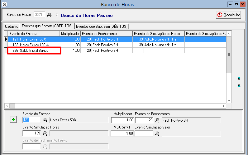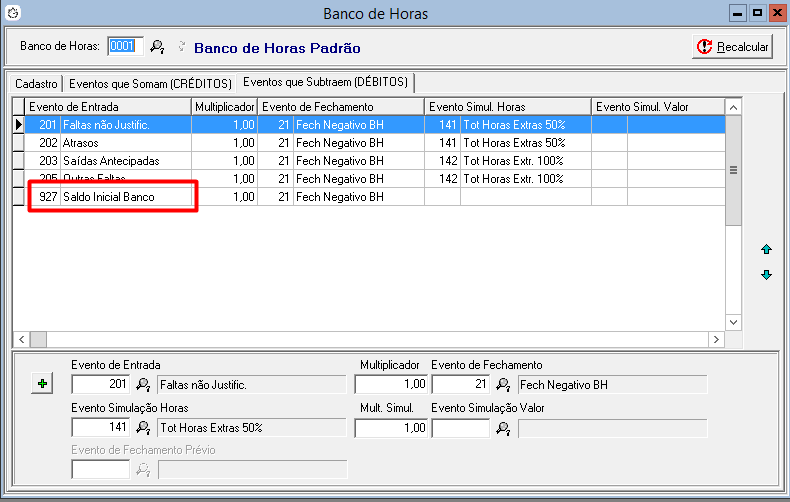 1. Acesse o cadastro de Banco de Horas, no menu Arquivo > Tabelas do Ponto > Banco de Horas e, verifique quais são os eventos de banco de horas do Saldo Inicial de crédito e de débito: