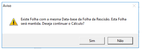 Ao calcular uma Rescisão com data-base igual a data-base da Folha Mensal, exemplo 31/05/2018 - Folha Mensal e Rescisão em 31/05/2018, aparecerá a seguinte mensagem:
