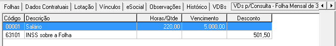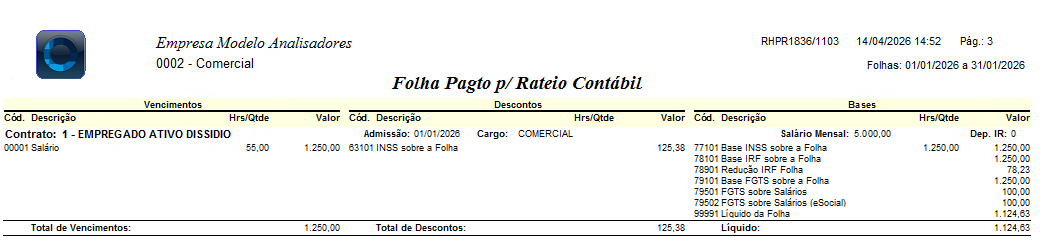 No exemplo, o colaborador trabalha no setor administrativo (25%), porém é alocado para executar suas atividades nos setores comercial (25%) e direção (50%).