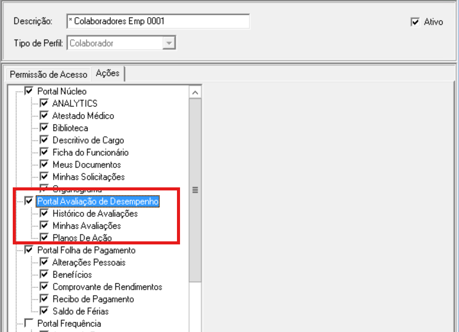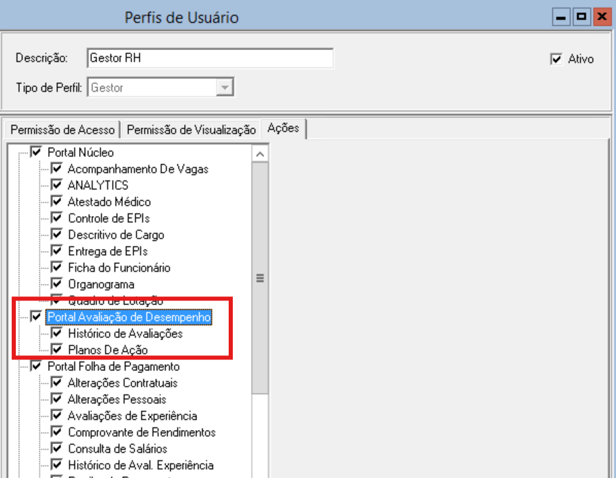 2 - Acesse o cadastro do perfil desejado e habilite as ações referente a avaliação de desempenho.