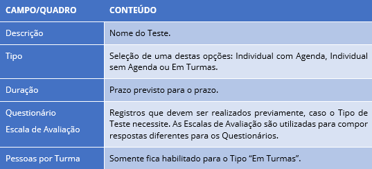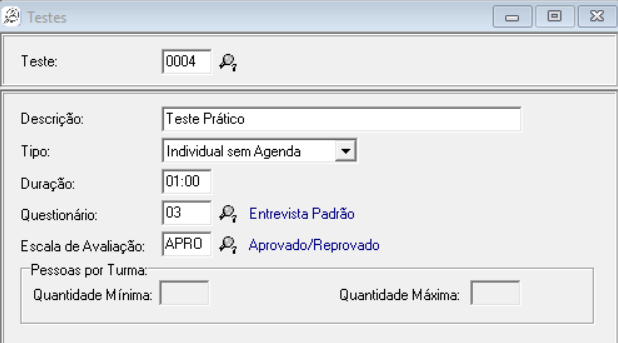 Para cadastrar Testes, acesse o Menu: Arquivo / Tabelas do Recrutamento / Testes.