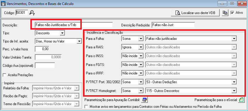 4. Caso não possua um VDB de Faltas sem Tributação cadastrado, cadastre-o conforme modelo abaixo: