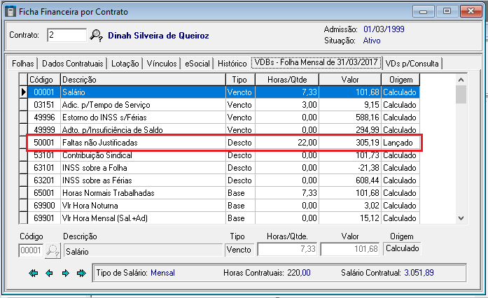 2. O próximo passo é verificar a causa do valor negativo. A situação mais comum é o contrato estar em férias no mês e ter lançamento de faltas. Estas faltas excedem as horas trabalhadas.