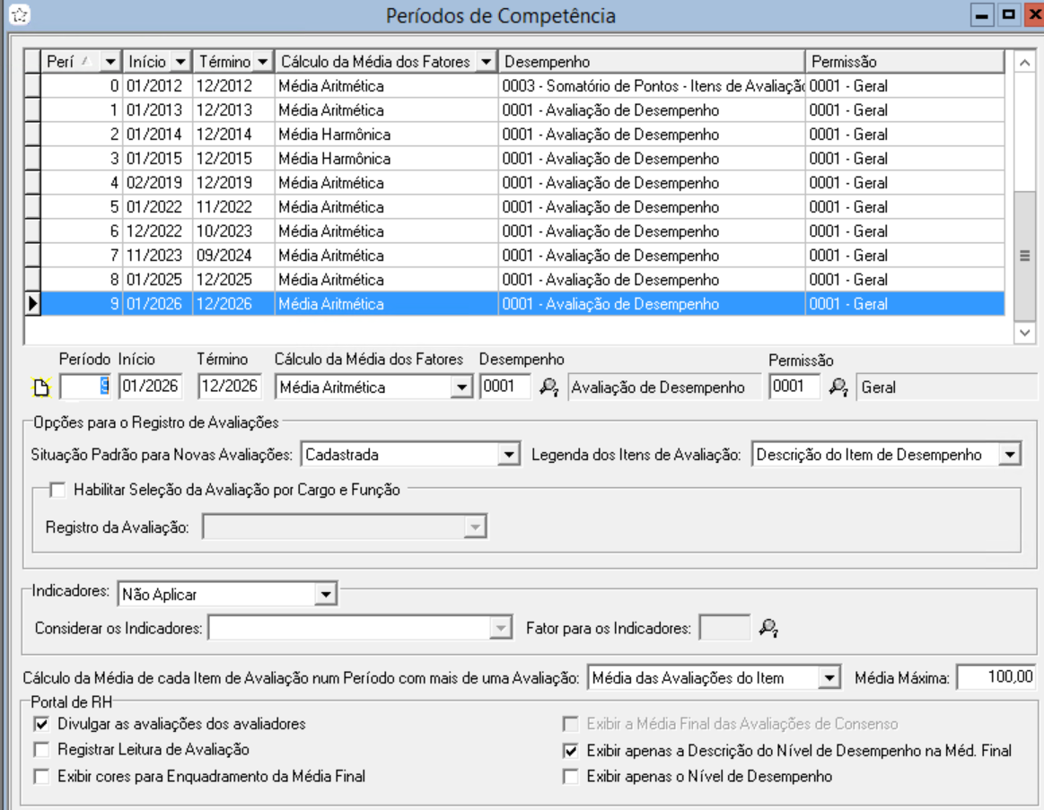 Para realizar essa configuração, no módulo Avaliação de Desempenho, acesse o menu: Arquivo > Tabelas de Avaliação > Períodos de Competência.