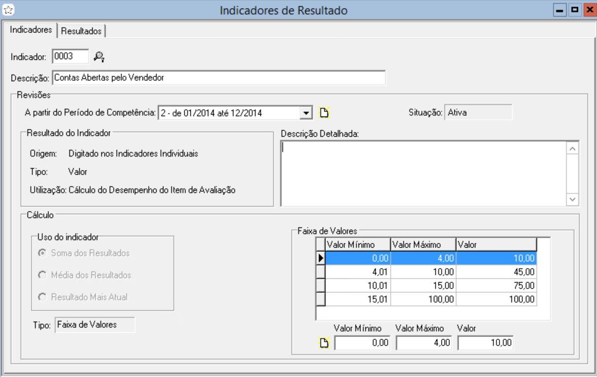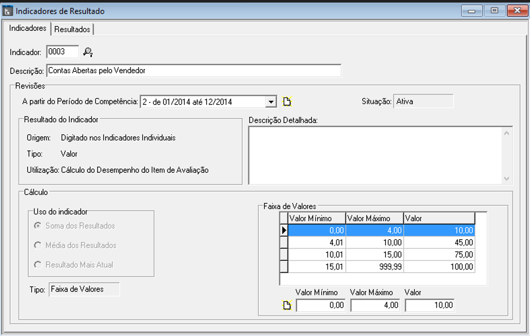 Ao usar o Tipo Faixa de Valores, no cadastro do Indicador, foi atribuído o resultado do desempenho para o Item de Avaliação: